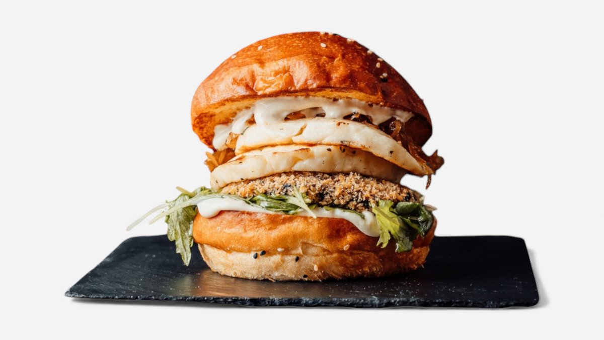 100g grilovaný sýr halloumi, smažené portobello v panko strouhance, rukola, cibulová marmeláda, mayo z pečeného česneku