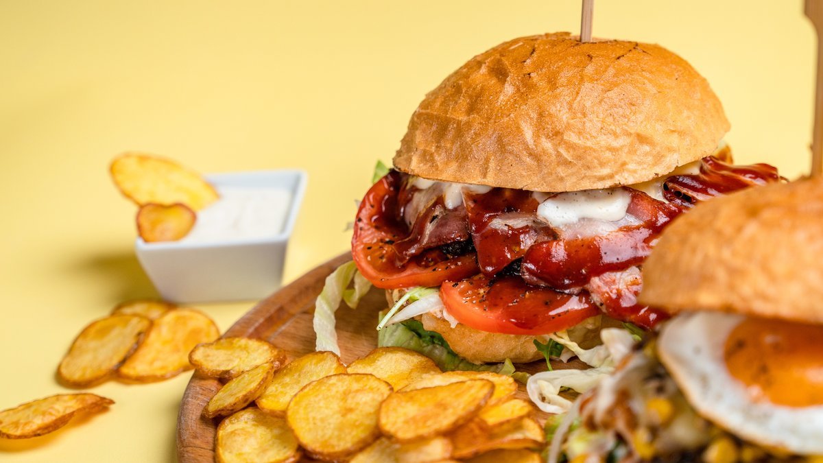 grilované hovězí maso, sýr cheddar, grilovaná slanina, rajče, cibule, majonéza, variace salátů, BBQ omáčka