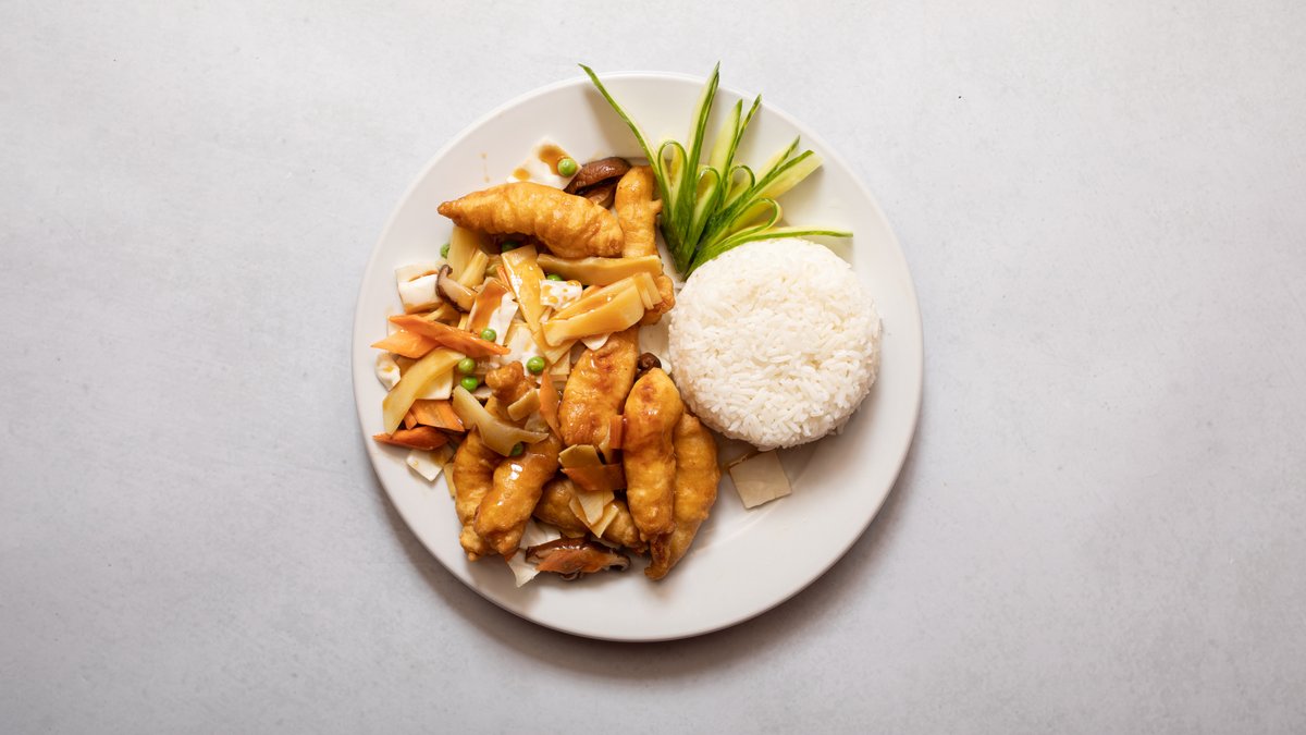 12. Kuřecí maso s bambusem a houbami(BEZ PŘÍLOHY)