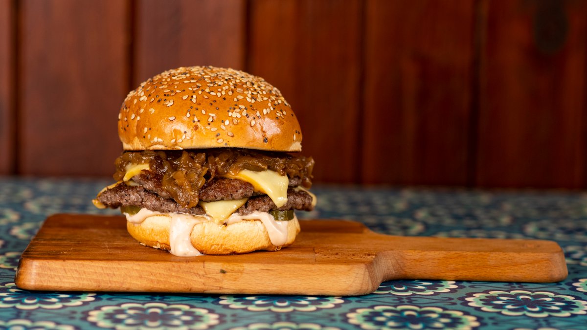 Máslová bulka, mleté české hovězí 100 gramů / 200 gramů, sezónní salát, burgerová omáčka, sýr Cheddar, smažená cibulka Obrázek je ilustrační