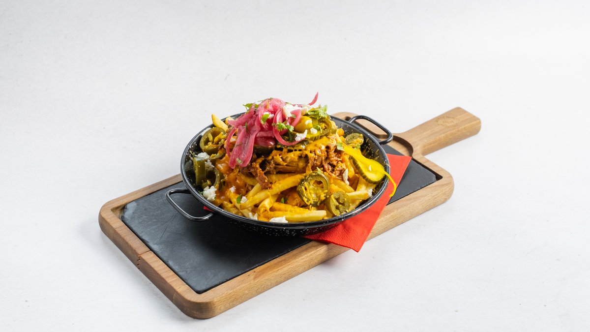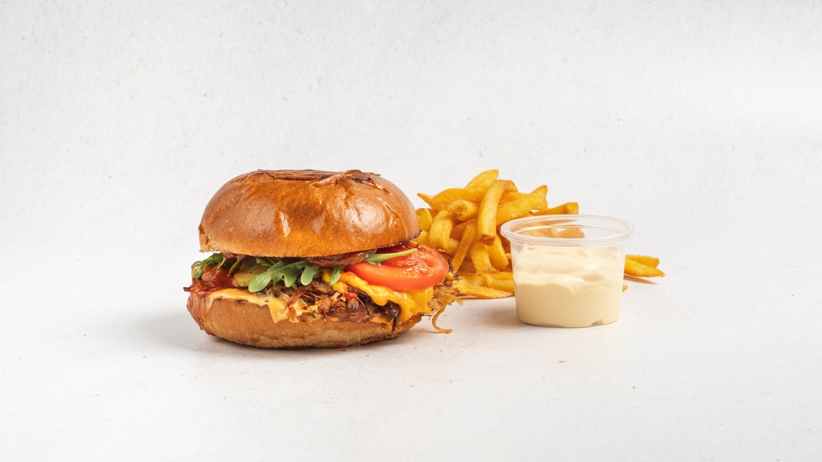 Máslová houska, české hovězí, sezonní salát, jalapeño mayo, slanina, papričky jalapeños, sýr cheddar, hranolky