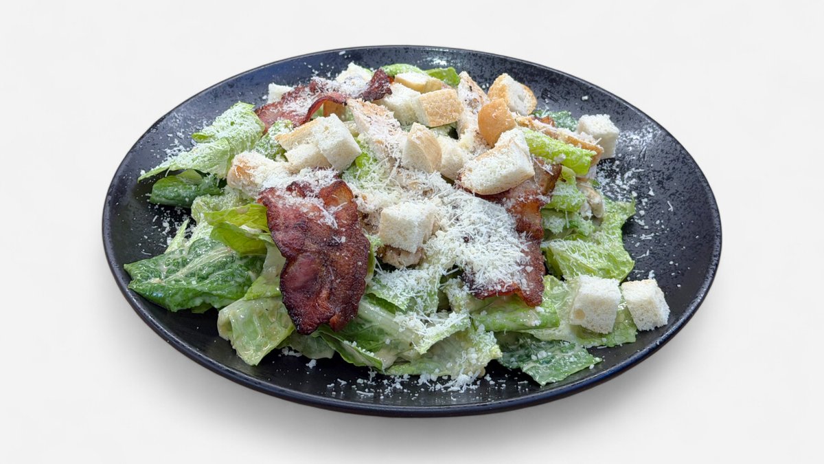 Caesar dresink bez ančoviček, krutony, slanina, kuřecí nudličky, sýr grana padano, římský salát.