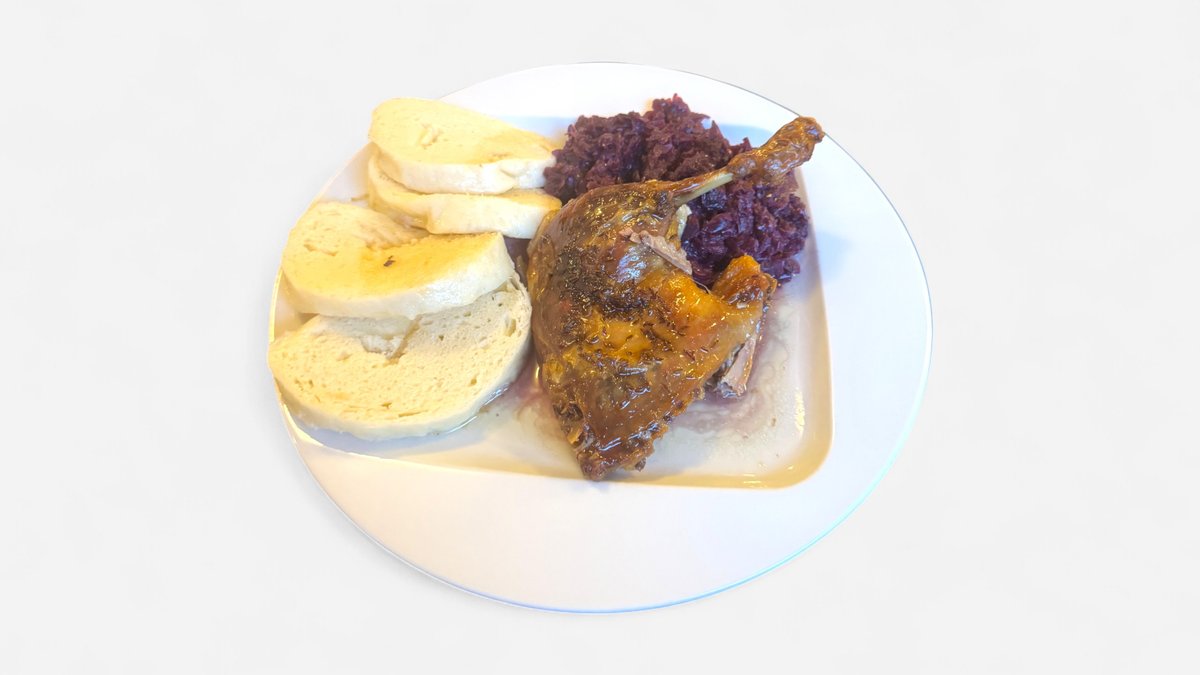 280g Kachní stehno, sous-vide, červené zelí, domácí bramborový knedlík