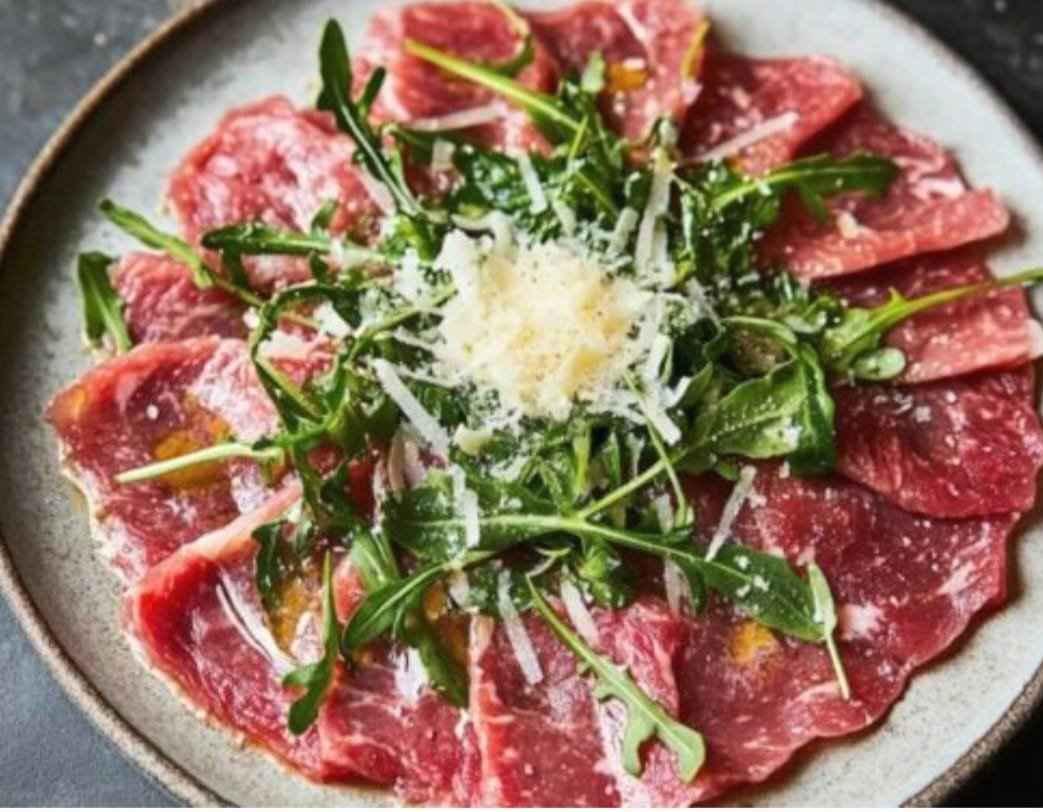 Beef carpaccio with parmesan, arugula, baguette (1a/7/8)