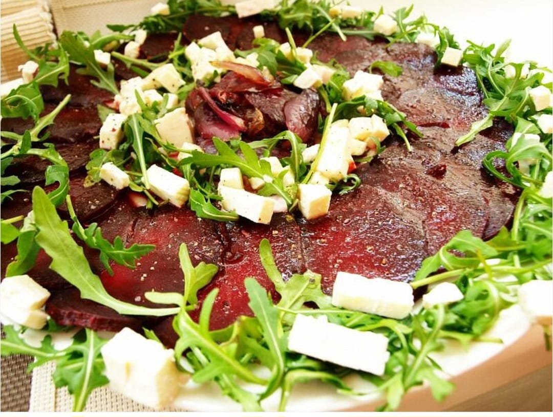100g Carpaccio z červené řepy, kozí sýr, vlašské ořechy, rukola, balzamiková redukce, opečená bageta