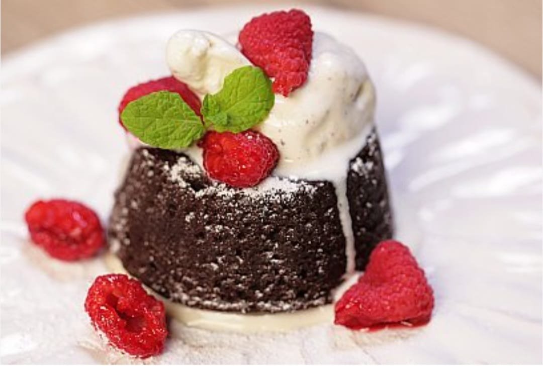 Chocolate fondant, vanilla ice cream, fruit (1a/3/6/7)