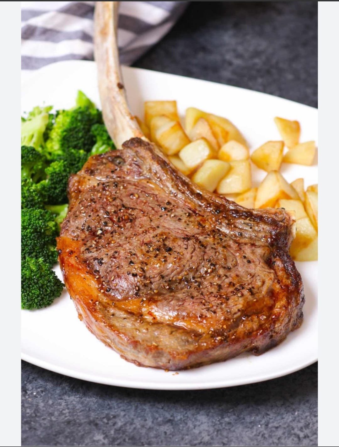 300g Vepřový Tomahawk v rumové marinádě, šťouchané brambory