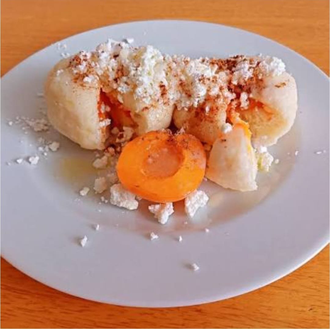 Homemade apricot dumplings, butter, sugar, cinnamon (1a/3/7)