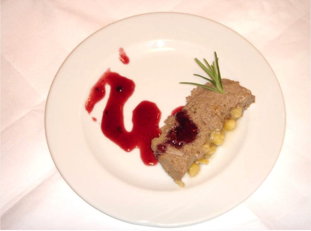 Homemade duck liver paté, cranberries jam, almonds, baguette (1a/3/8a)