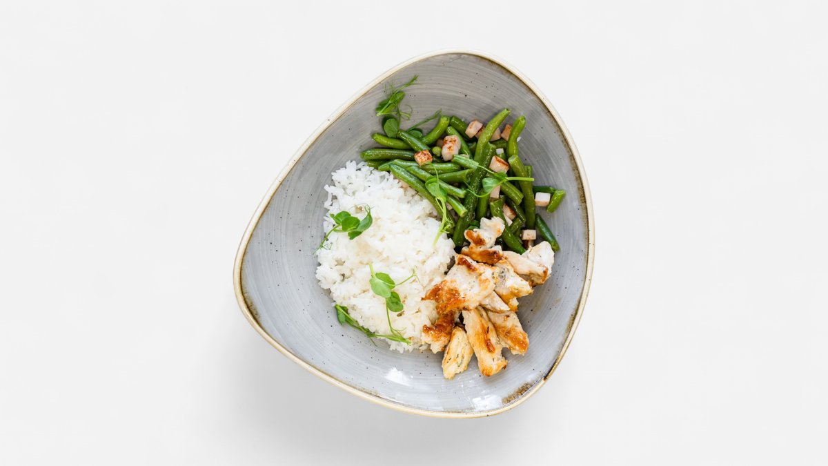 s jasmínovou rýží a opečenými fazolkami se šunkou