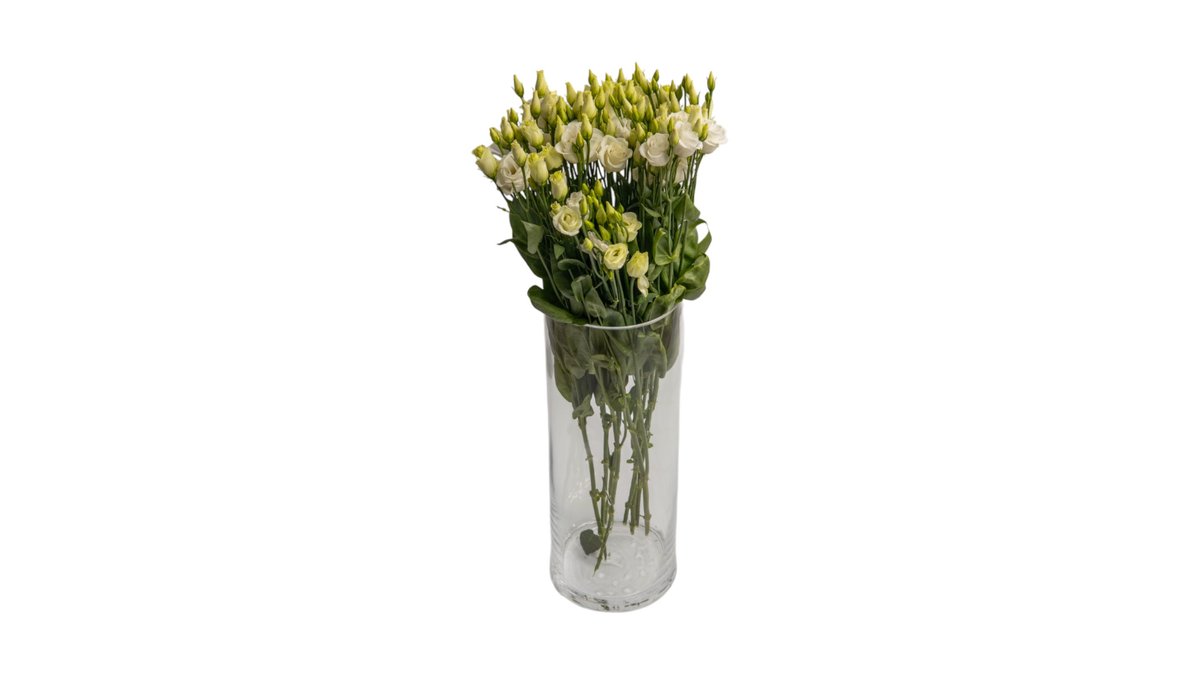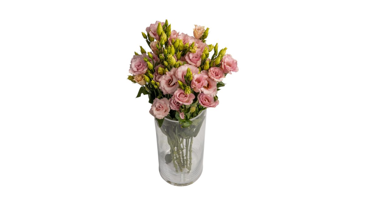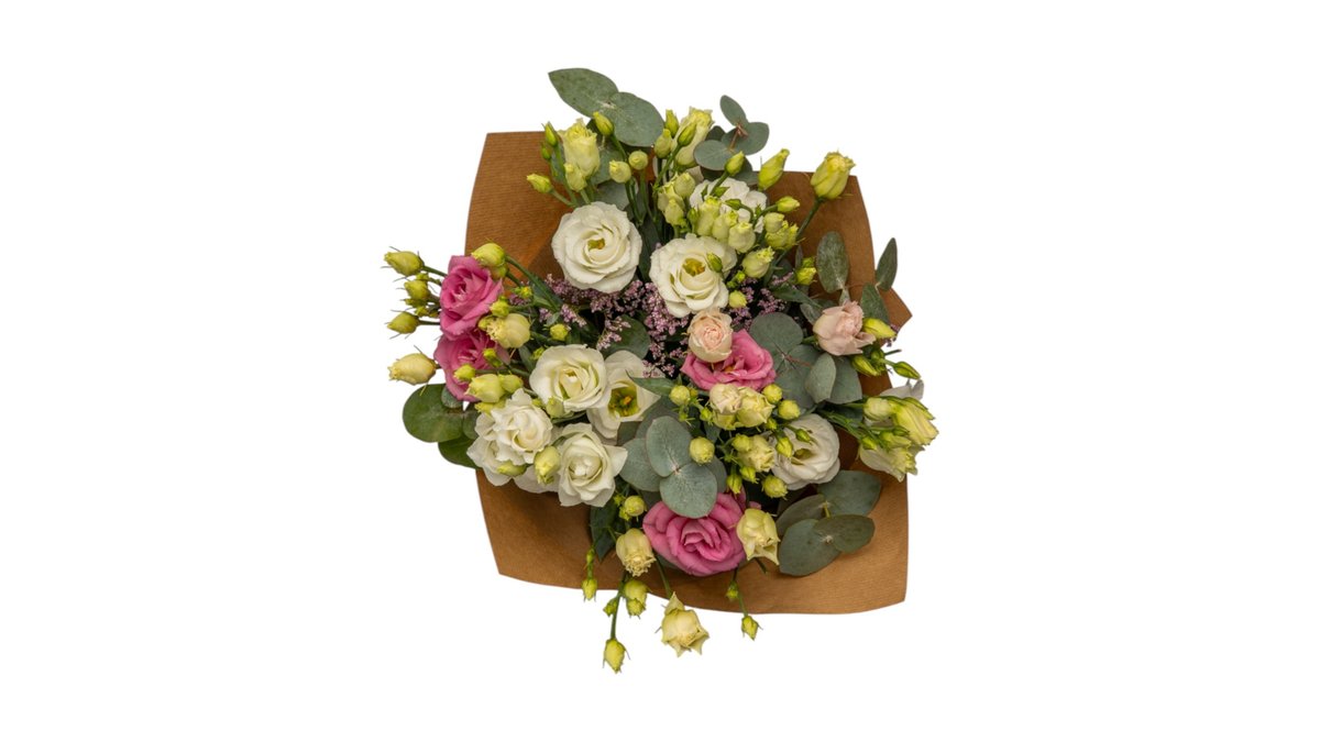 Kytice je složená z bíle a růžové Eustomi v papírové manžetě
