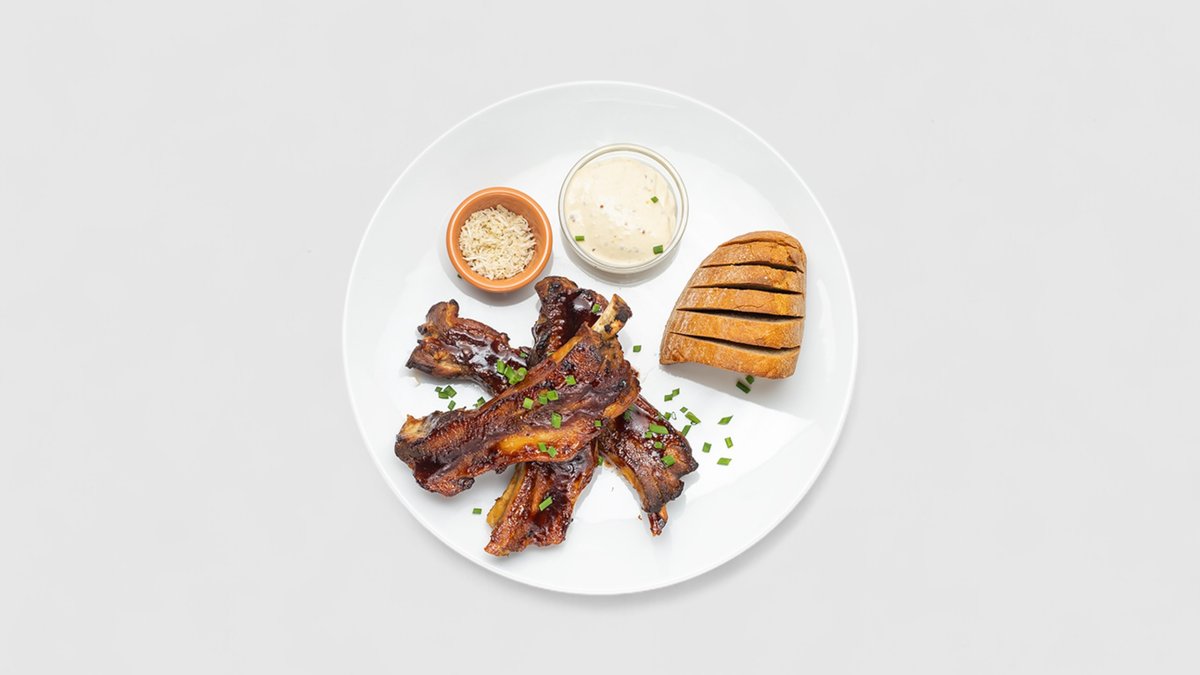 Pečená vepřová žebra BBQ marinovaná, česnekový dresink, hořčice, křen, okurka