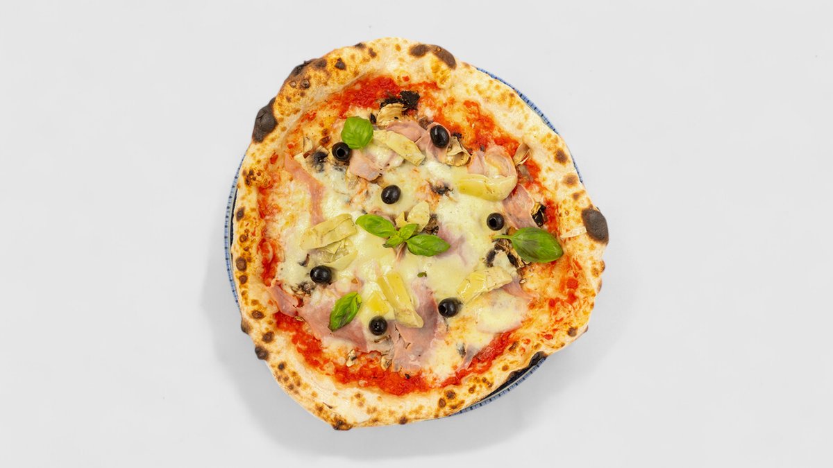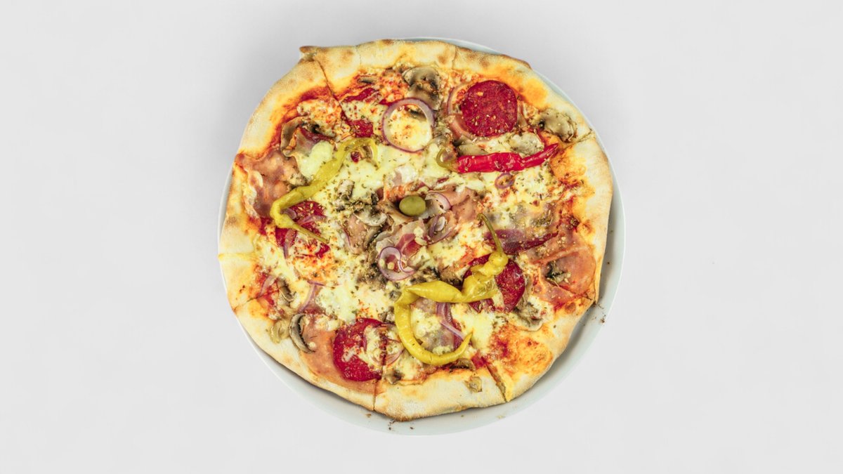 Rajčatová omáčka, sýr, šunka, olivy, žampiony, parmazán | Alergeny: 1,5,6,7