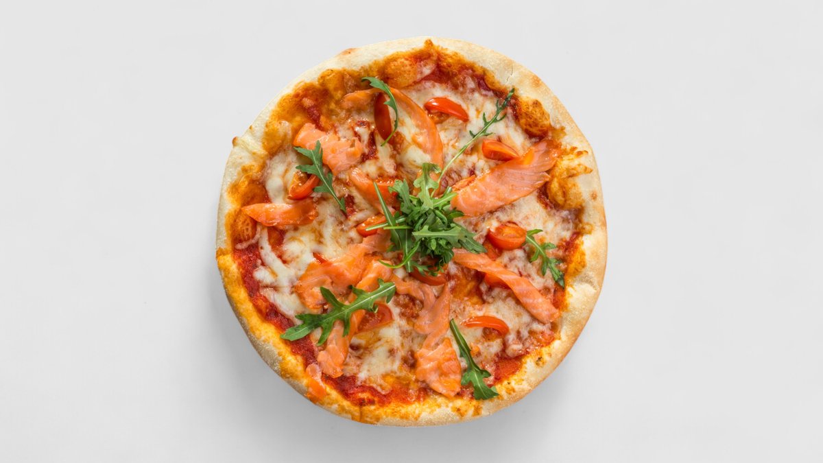 Rajčatová omáčka, sýr, čerstvá rajčata, losos, rukola | Alergeny: 1,4,5,6,7
