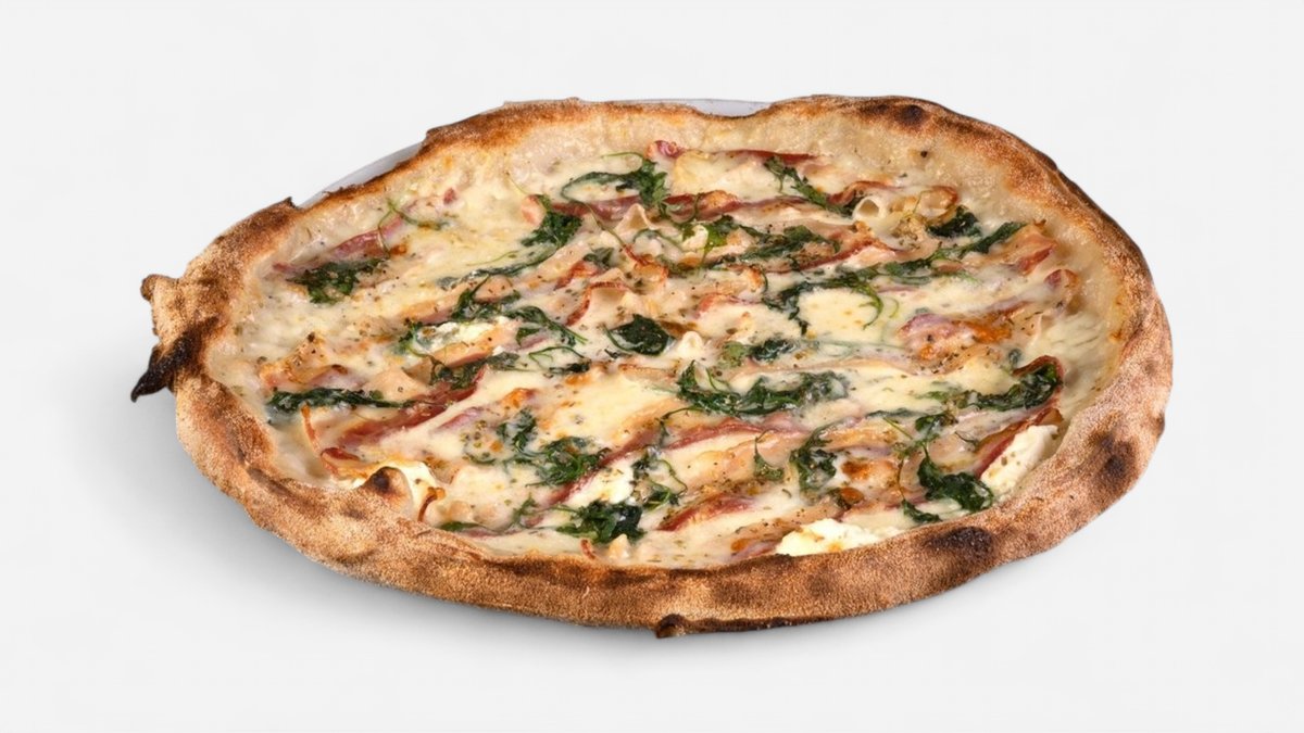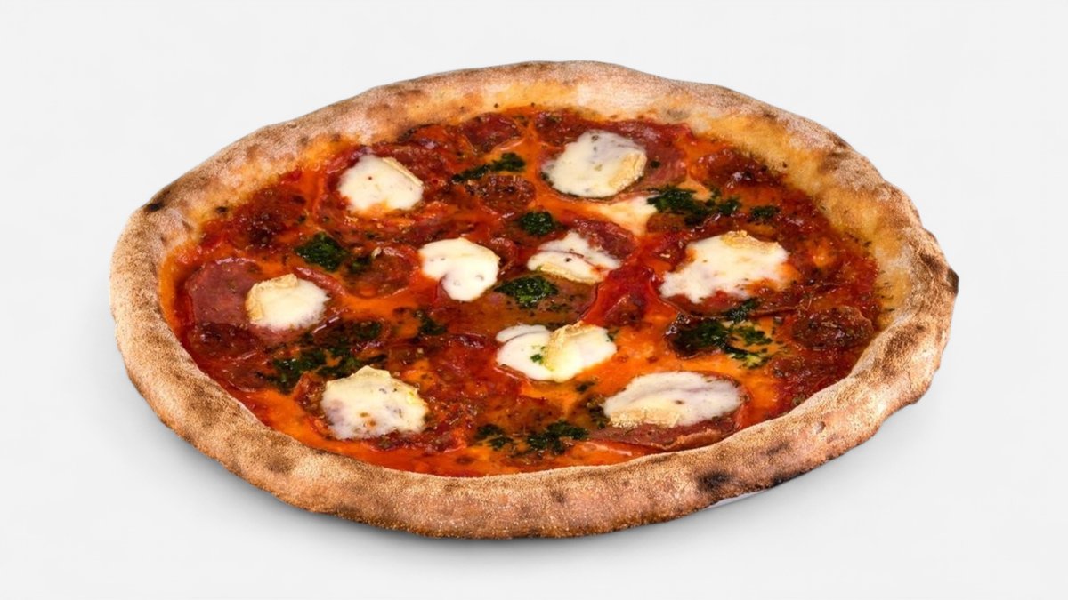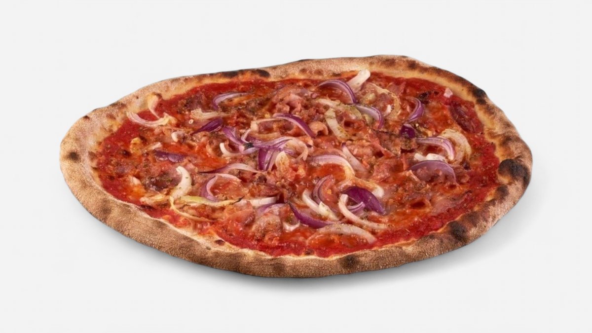 rajčata San Marzano, Mozzarella fior di latte, pancetta zauzená, Taleggio, cibule, pepř, oregano