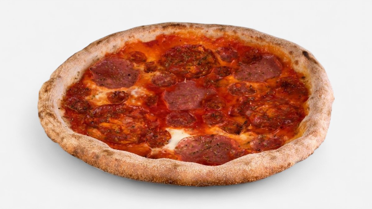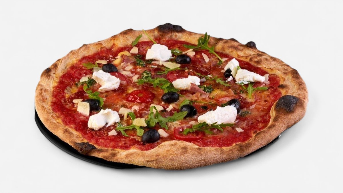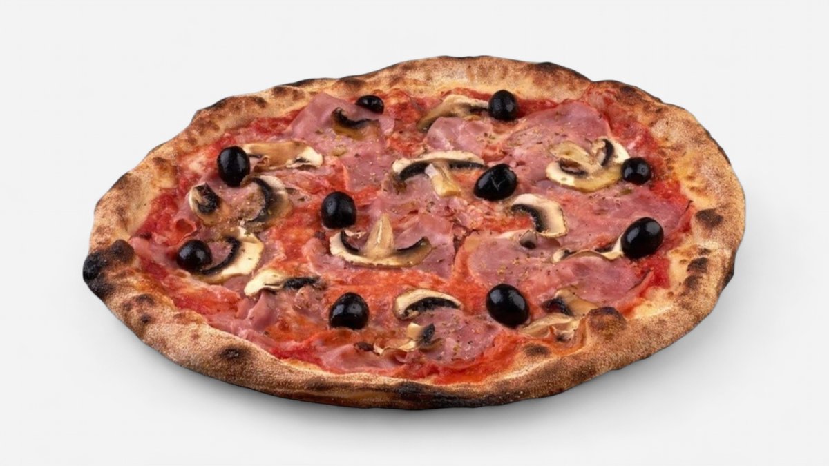 rajčata San Marzano, mozzarella fior di latte, šunka, žampiony, olivy černé, olivový olej extra virgin, oregano
