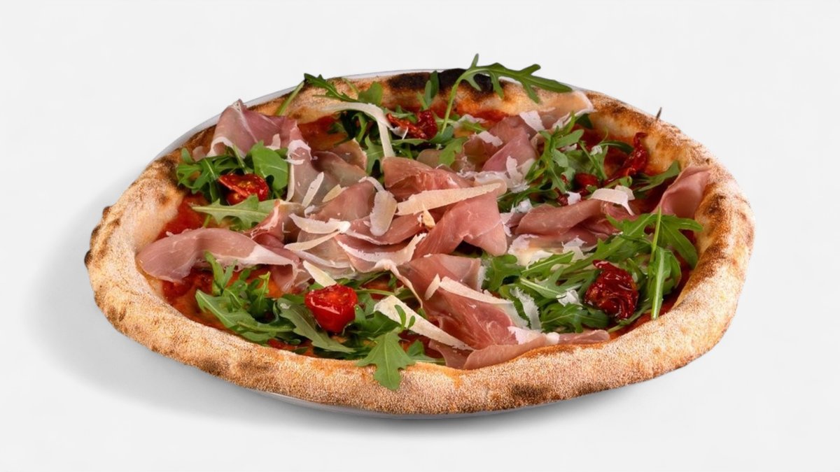rajčata San Marzano, mozzarella fior di latte, olivový olej extra virgin, Prosciutto crudo, čerstvá rukola, nakládané sušené rajčátka, Parmigiano Reggiano hobliny