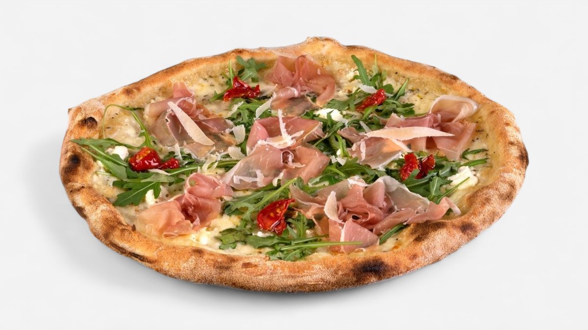 mozzarella fior di latte, smetana, Parmigiano-Reggiano, Prosciutto Crudo, rukola, sušená rajčátka, oregano, tymián