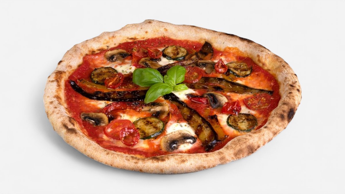 rajčata San Marzano, fior di latte, grilovaný lilek -cuketa - papriky, žampiony, rajčata plátky, oregano, tymián, sušená cherry rajčátka, bazalka, Parmigiano Reggiano hobliny