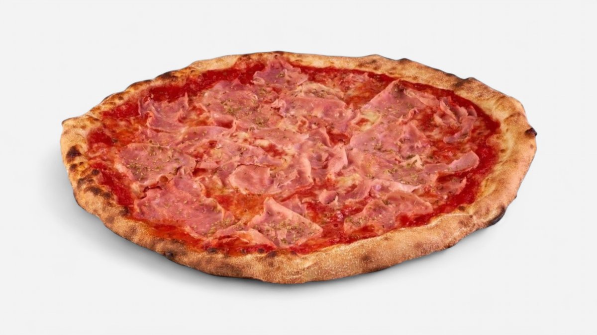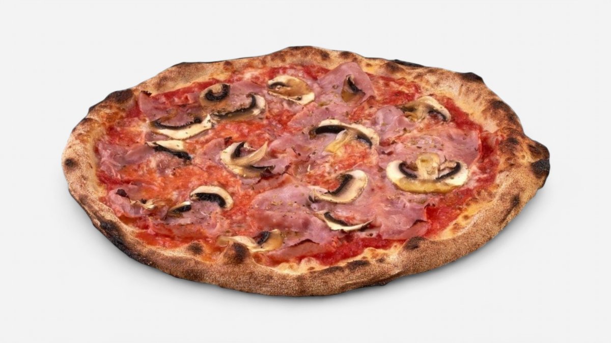 rajčata San Marzano, mozzarella fior di latte, šunka, žampiony, olivový olej extra virgin, oregano