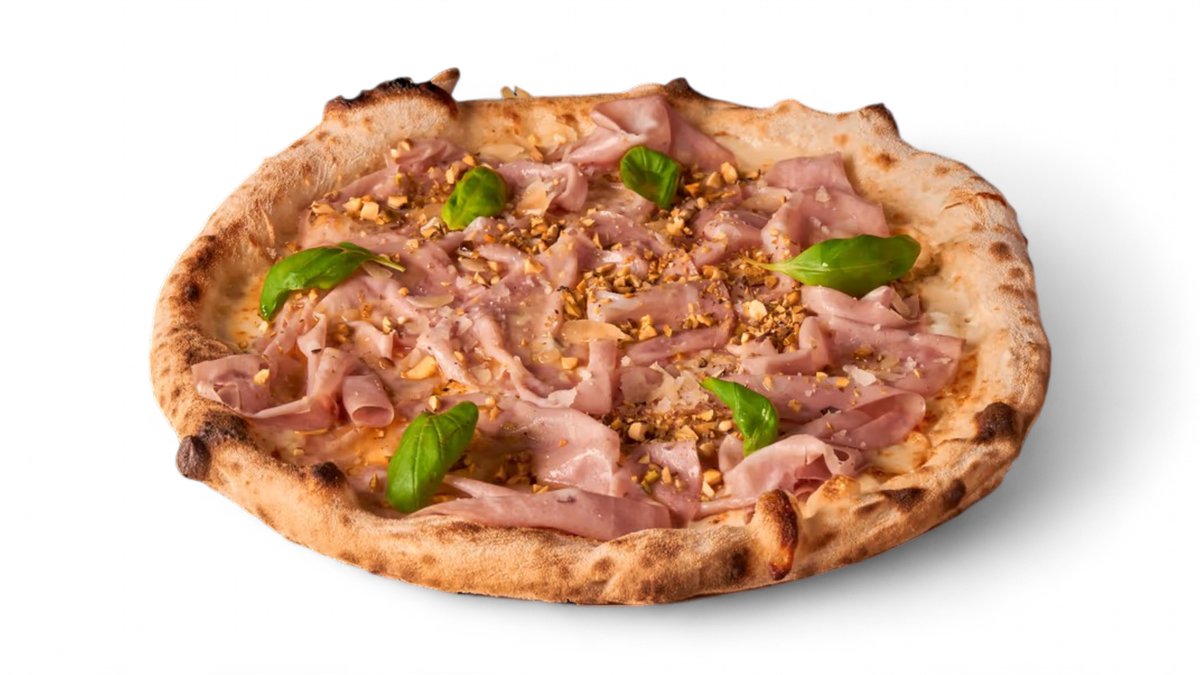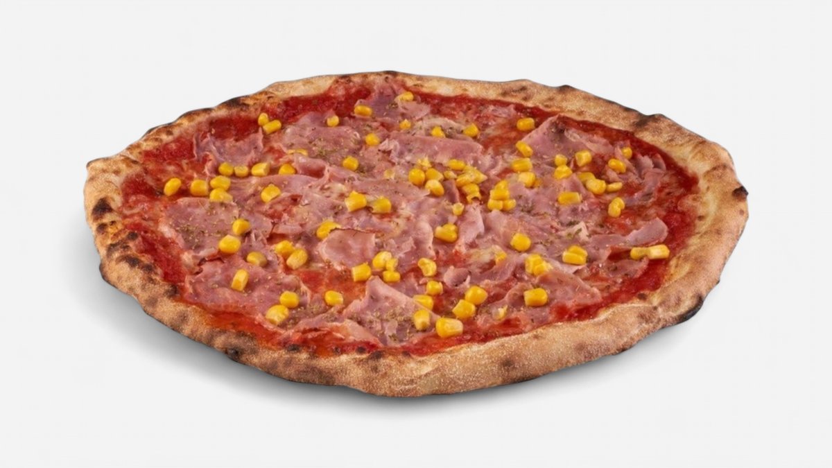 rajčata San Marzano, mozzarella fior di latte, šunka, kukuřice sladká, olivový olej extra virgin oregano