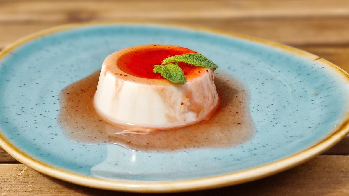 Extra smetanový dezert s 🍓 jahodovým přelivem.