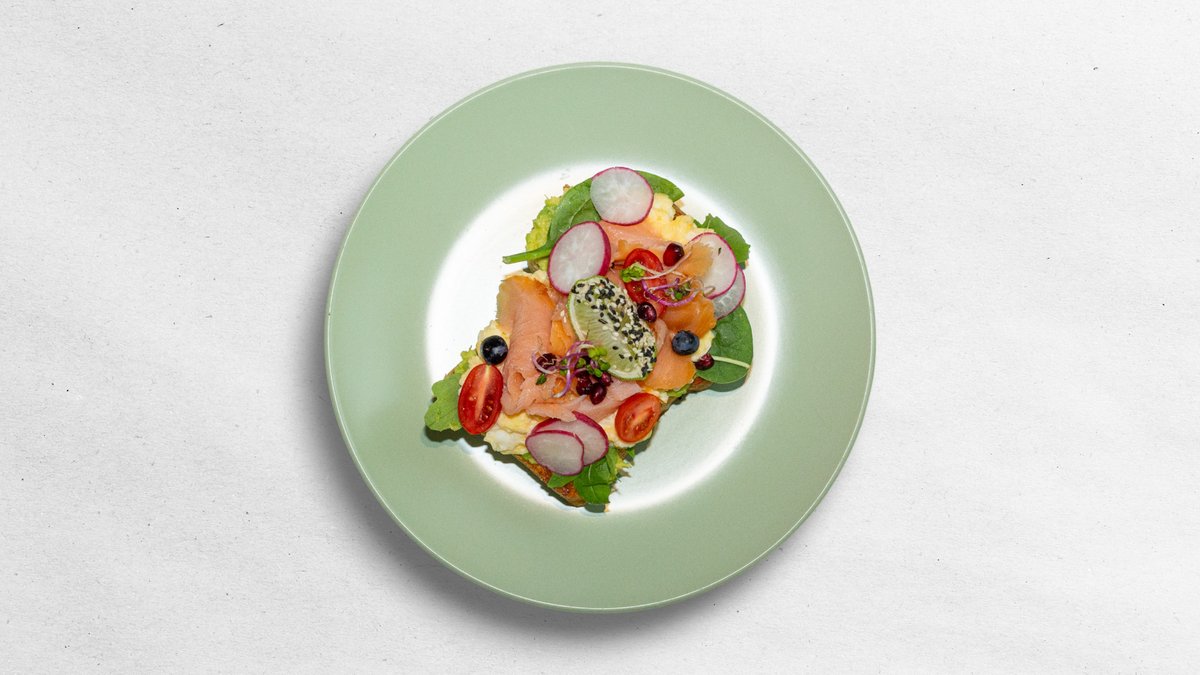 Toast s avokádem, míchaná vejce, uzený losos, microgreens, sezam, granátové jablko