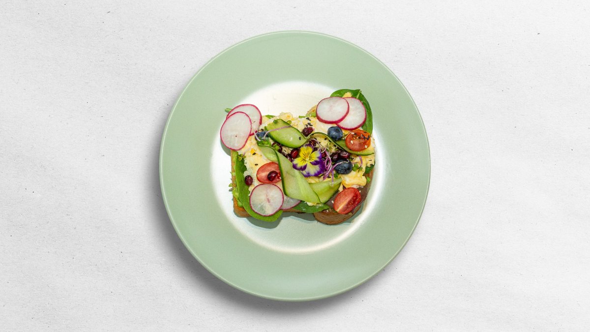 Toast s avokádem, čerstvým sýrem, míchanými vejci, granátovým jablkem, microgreens