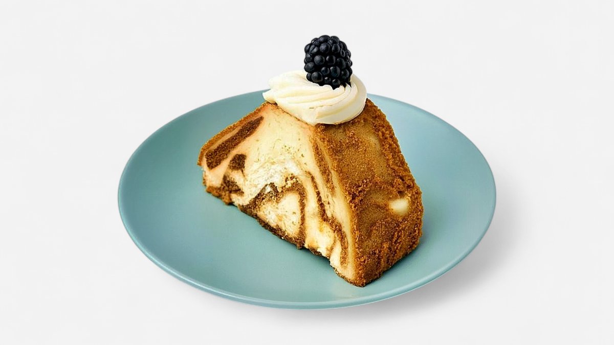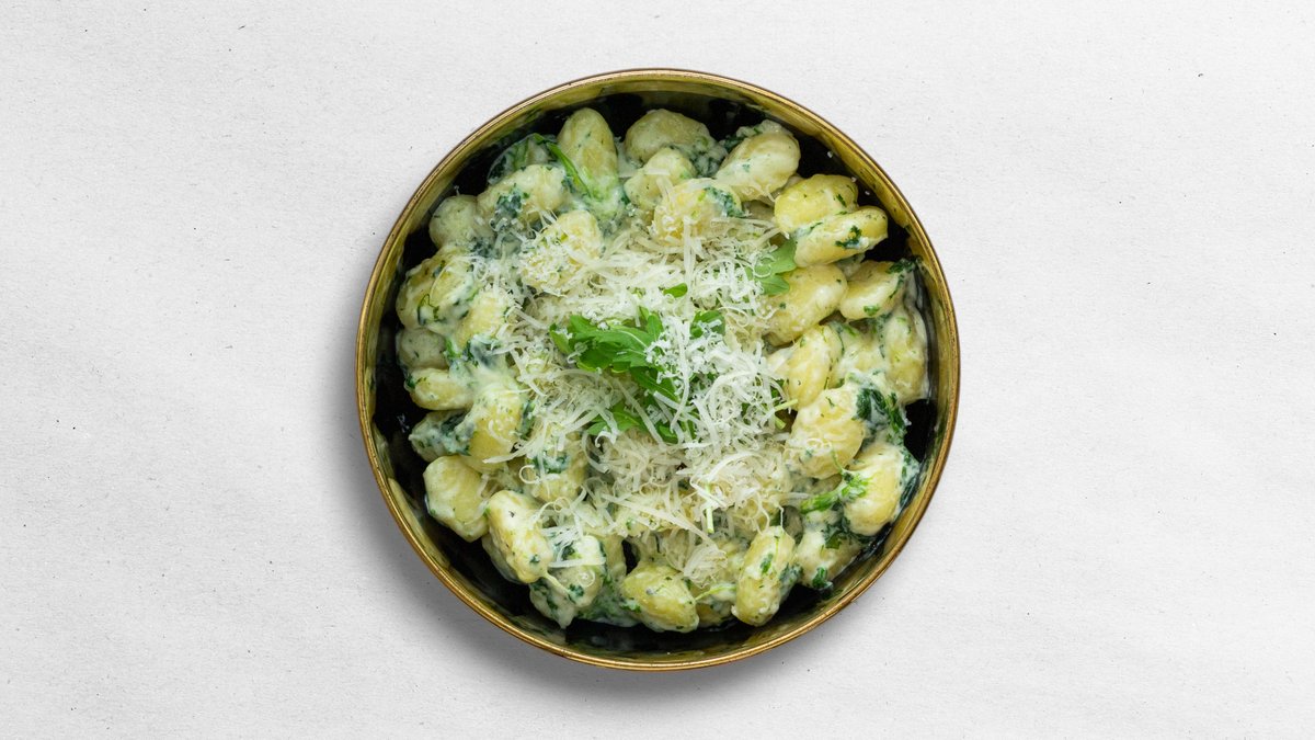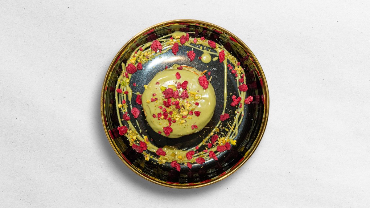 Čtyři lívance doplněné křupavým kadayifem, jemnou pistáciovou pastou s krémovou nutellou, praženými pistáciemi a lyofilizovanými malinami.