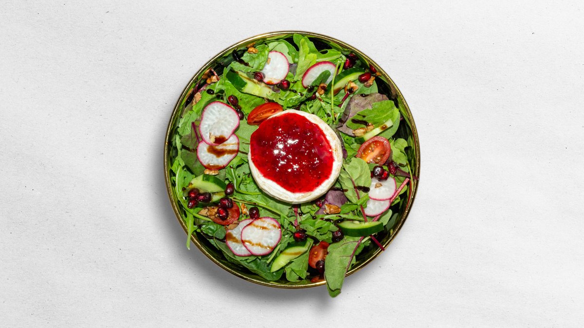 Mix listových salátů a zeleniny, 100g hermelín, vlašské ořechy, brusinkový dip