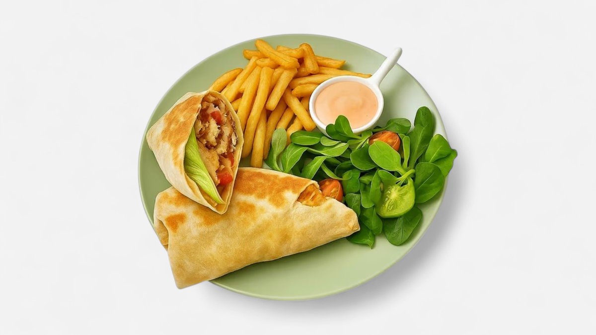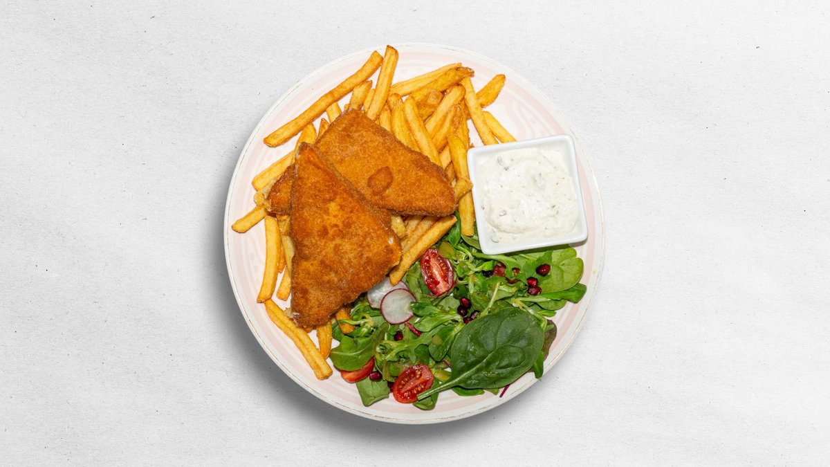 S kuřecími stripsy 100g, ledový salát, rajče, americký dressing a hranolky