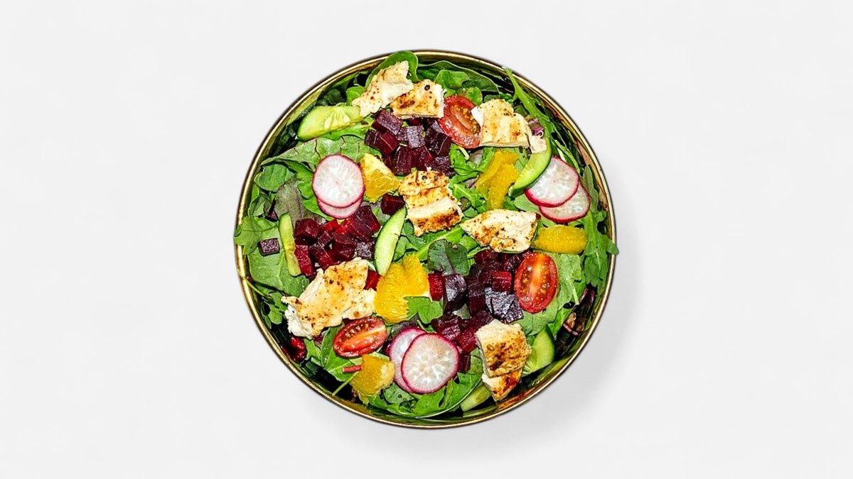 Mix salátů a zeleniny, 100 g kuřecí maso, červená řepa, pomeranč, sezamové semínka