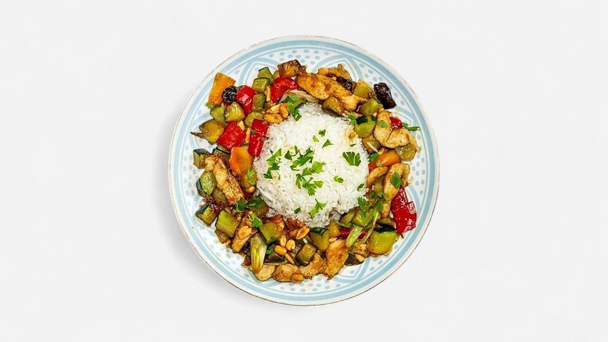 130 g kuřecí prsa, zelenina, arašídy, rýže