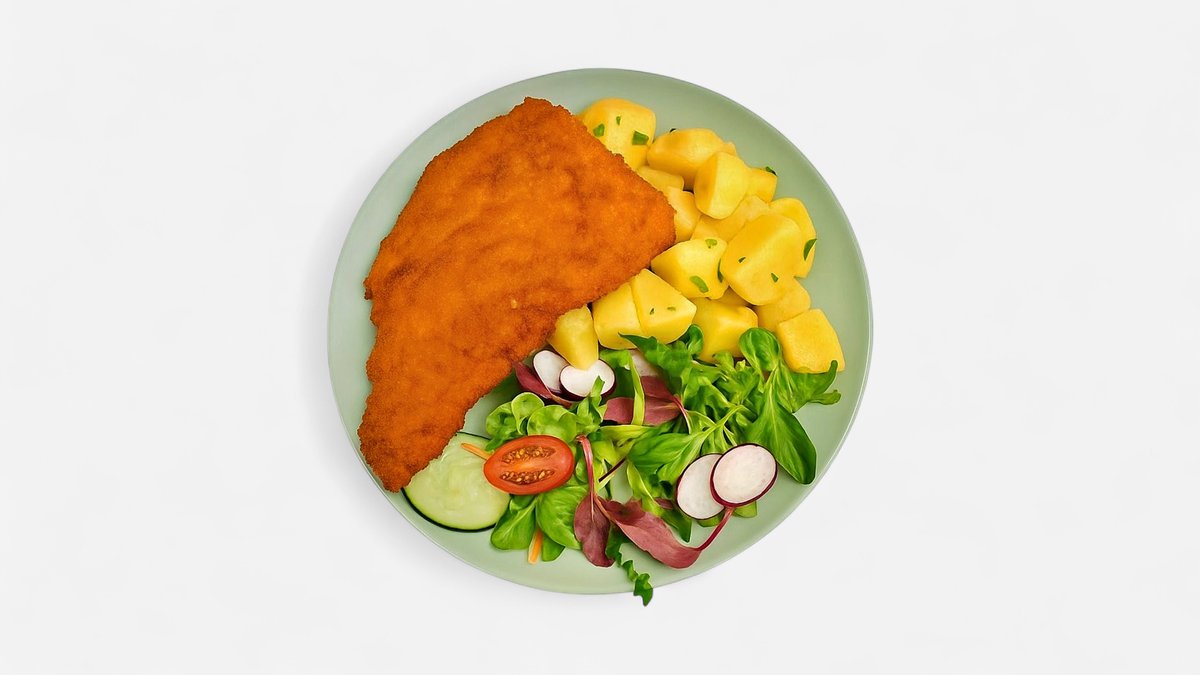 Smažený kuřecí řízek, štouchané brambory s máslem