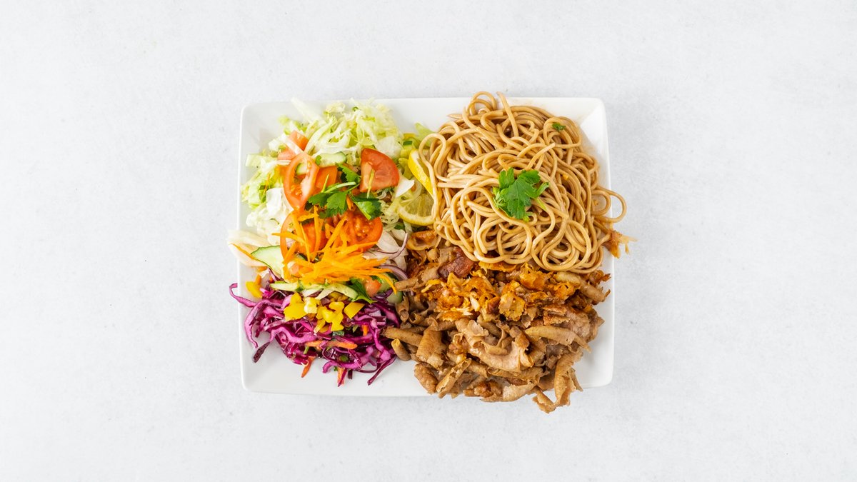 Maso, nudle, zelenina, ledový salát, bílé zelí, červené zelí, cibule, rajčata, dresink