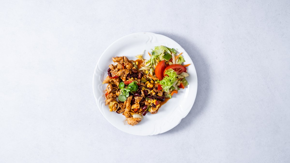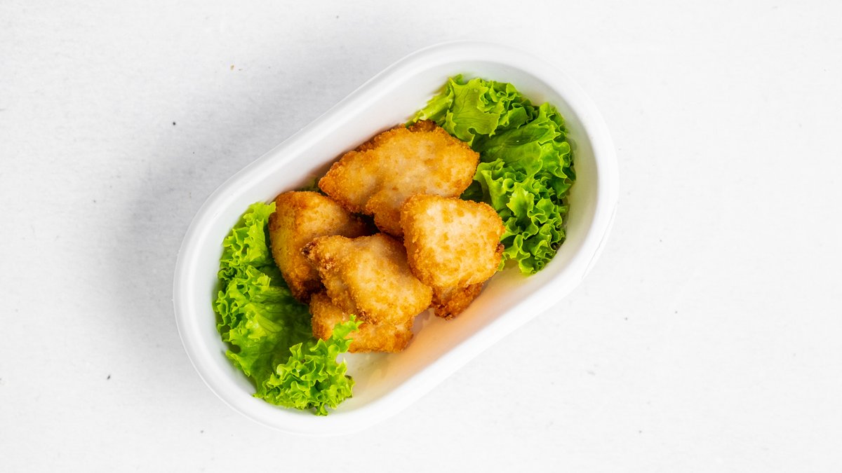 kousky kořeněného kuřecího masa s přílohou dle výběru