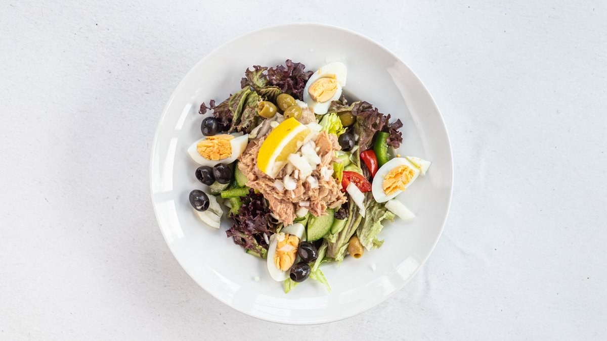 Salát s bylinkovým dresinkem, tuňákem, vejcem a krutony