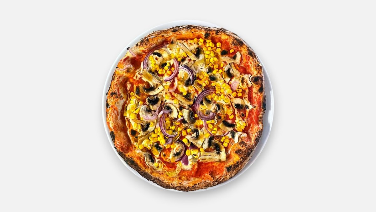 rajčatový základ, homemade kešurella, červená cibule, žampiony, kukuřice, olivový olej extra virgin