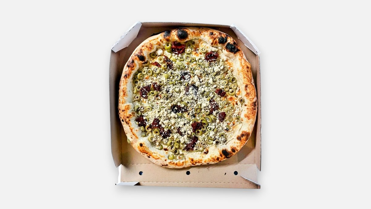 kešu světlý základ, olivy, sušená rajčata, vegan parmazán, olivový olej extra virgin
