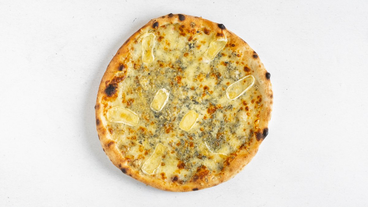 Rajčatový základ, mozzarella, niva, slanina, parmazán