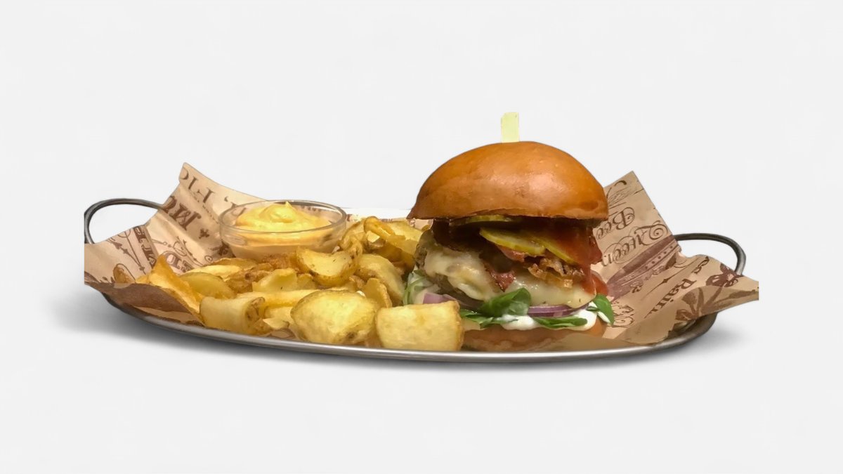 160 g hovězí maso, schwarzwaldská šunka, cheddar, gouda, okurek, salát, červená cibule, pepřová omáčka, BBQ + hranolky dippers + omáčka, houska sypaná sezamem (A 1,3,7, 11)