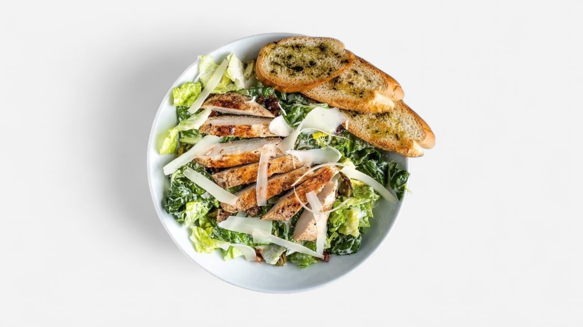 200 g kuřecí maso, římský salát, slanina, gran moravia, kapary, krutony, caesar dresink a rozpečená brioška
