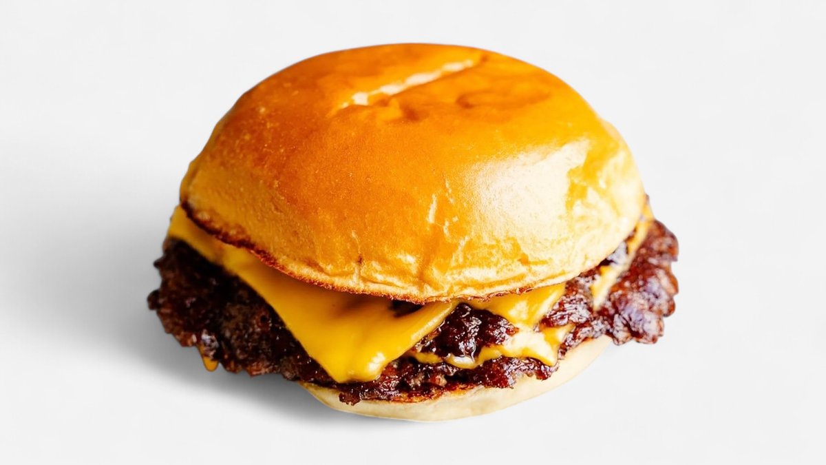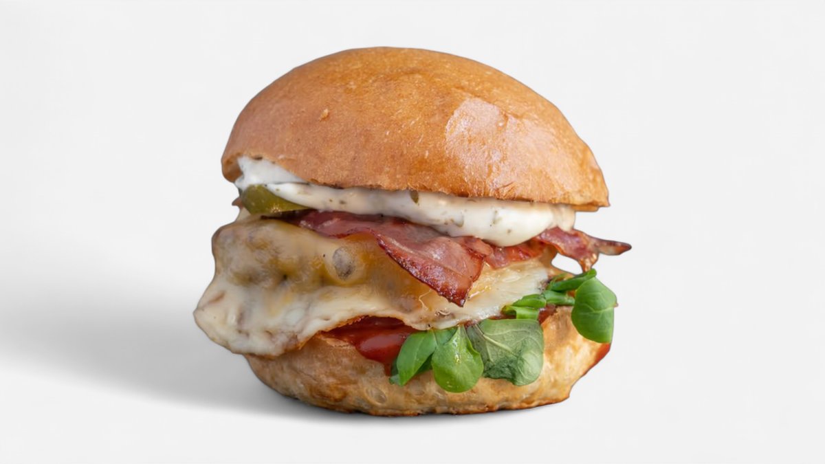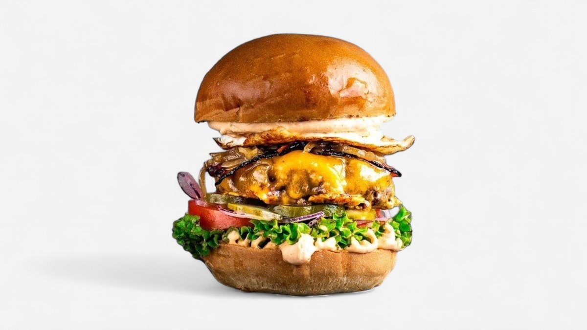 2x 160 g hovězí maso, 2x cheddar, 2x slanina, okurek, karamelizovaná červená cibule, nakládaný římský salát, dijonská a slaninová majonéza, houska sypaná sezamem