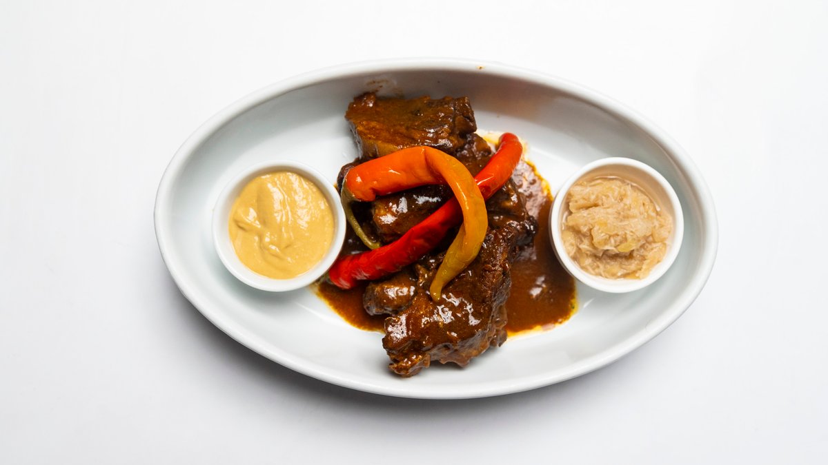 marinovaná v BBQ omáčce, servírovaná s beraními rohy, hořčicí, křenem a rozpečeným chlebem