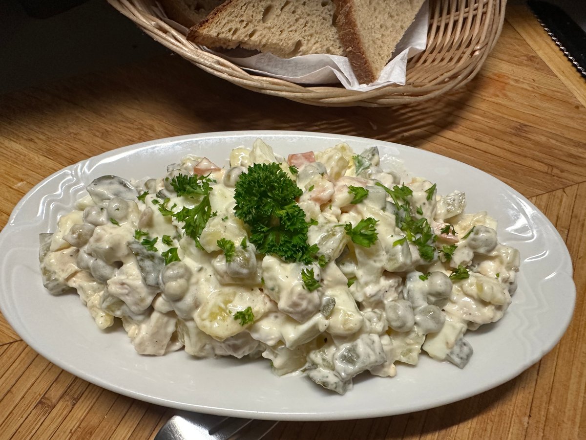 250g, netradiční bramborový salát z brambor, kyselých okurek, mrkve, hrášku, vajíček, masa a majonézy