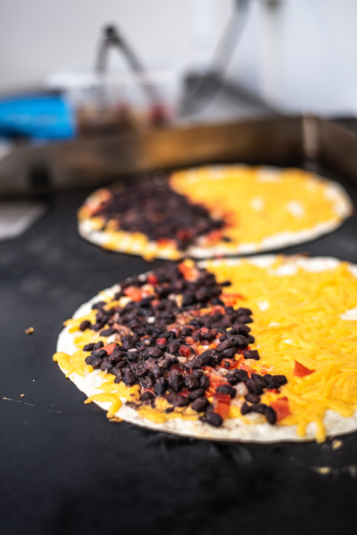 Pšeničná tortilla, čedar, černá fazole, zelenina dle výběru, salsa. / Grilled flour tortilla filled with cheddar, black beans, vegetable of choice, salsa.