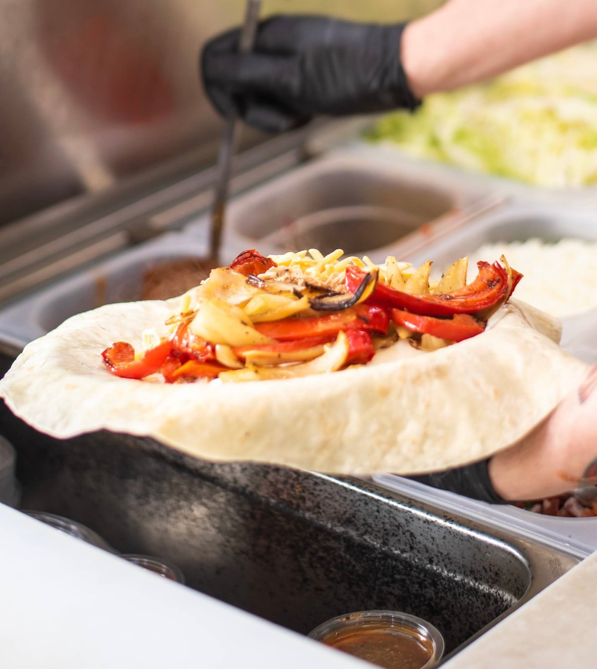 Pšeničná tortilla, rýže, maso, zeleninové fajitas, čedar, zakysaná smetana, guacamole, salsa. / Flour tortilla filled with rice, grilled onion&sweet pepper, cheddar, sour cream, guacamole, meat and salsa.