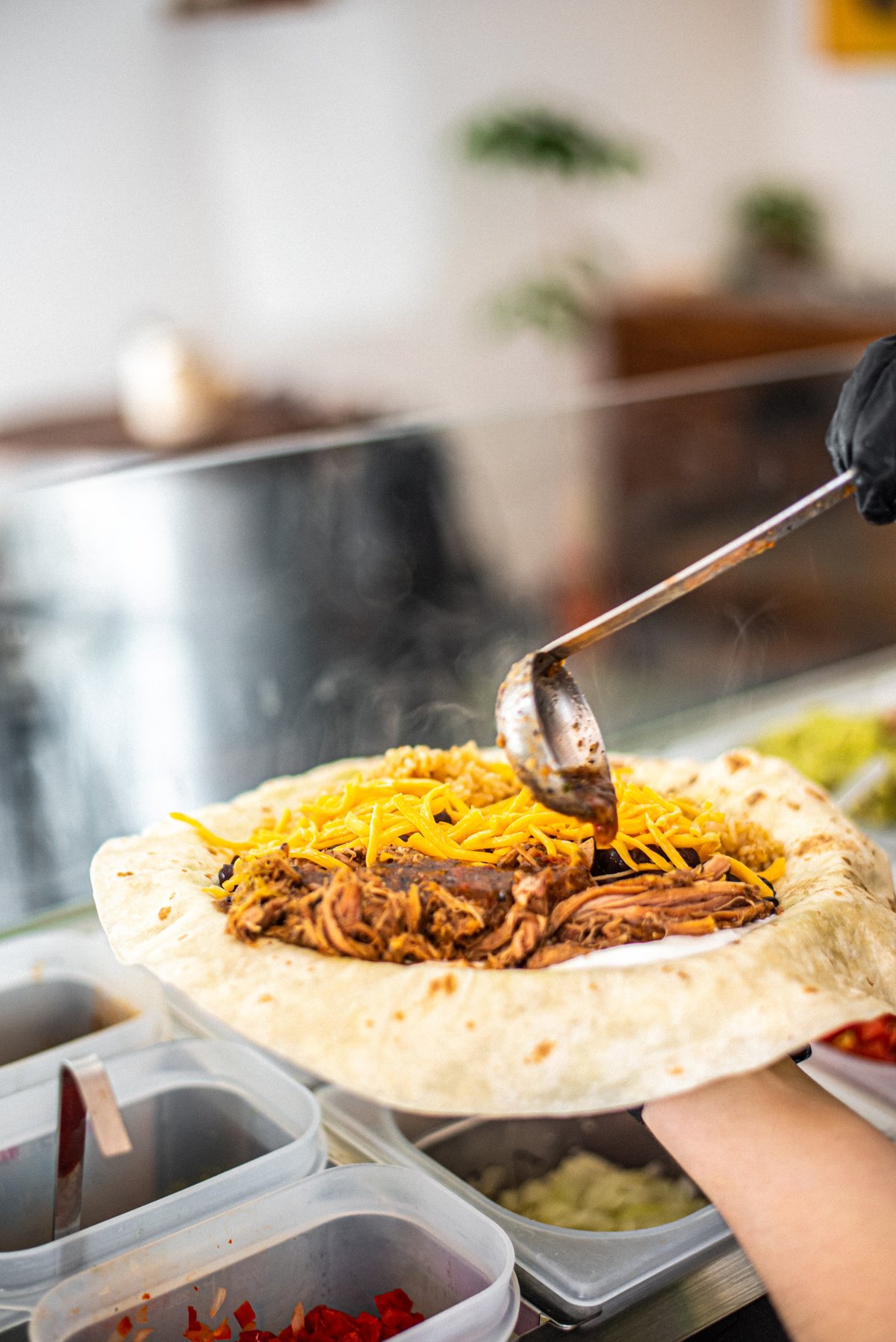 Velká pšeničná tortilla, rýže a fazole dochucené vlastními směsi koření, šťavnaté maso, čedar, naše salsa. / Flour tortilla filled with rice, black beans, cheddar, meat and salsa