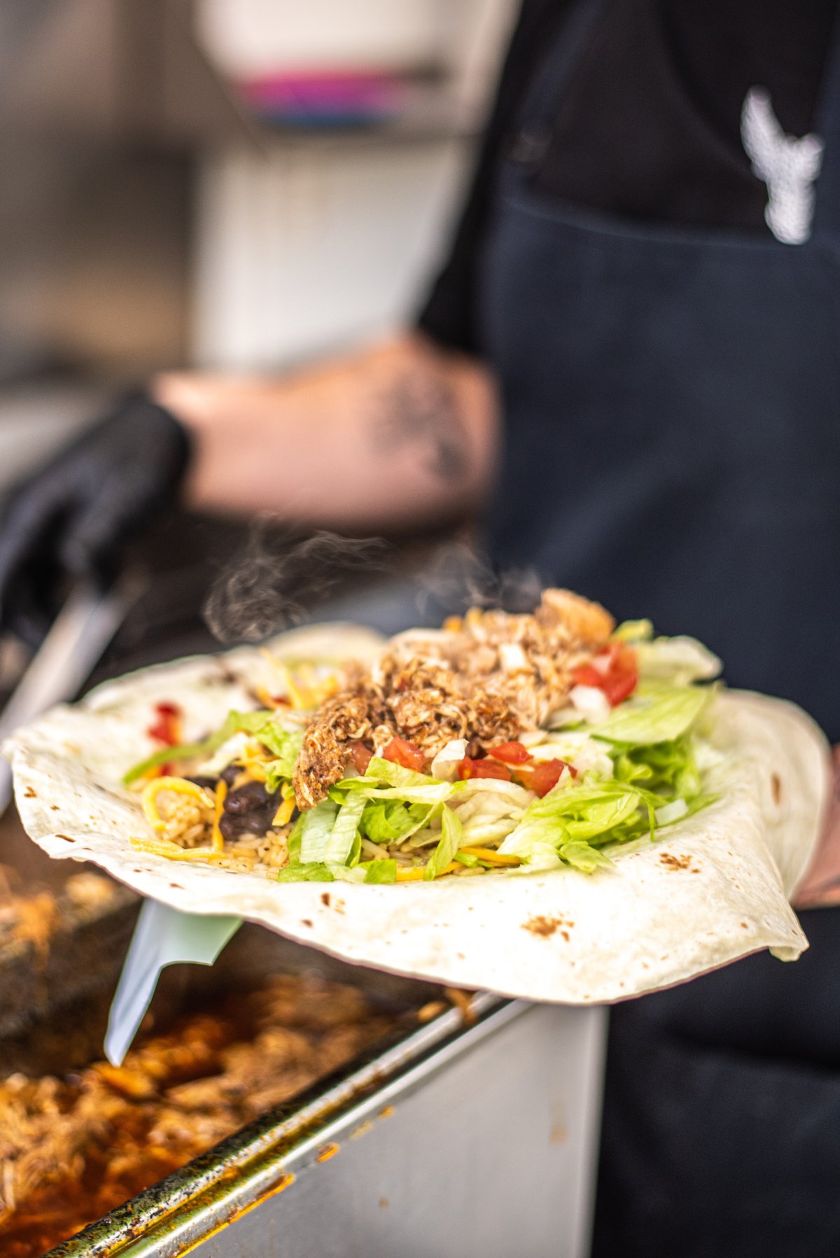 Velká pšeničná tortilla, rýže a fazole dochucené vlastními směsi koření, šťavnaté maso, čedar, naše salsa, zakysaná smetana a čerstvé guacamole./ Flour tortilla filled with rice, black beans, cheddar, sour cream, guacamole, meat and salsa