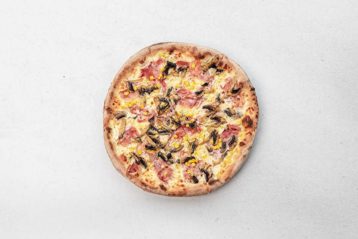 smetana, kukuřice, oregano, mozzarella, šunka, žampiony
